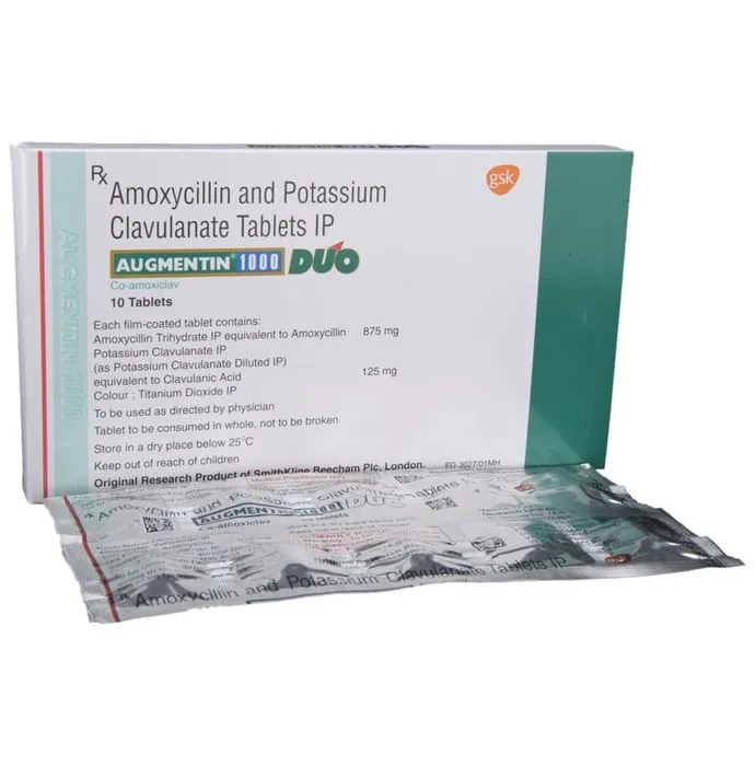 Augmentin 1000 Duo Tablet is a potent antibiotic combining amoxicillin and clavulanic acid, used to treat various bacterial infections, including respiratory tract infections (pneumonia, bronchitis), sinusitis, ear infections, urinary tract infections (UTIs), and skin/soft tissue infections. It works by killing bacteria while preventing resistance.