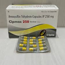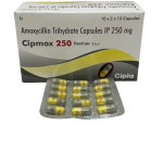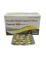 Cipmox 250 Capsule is an antibiotic used to treat a wide variety of bacterial infections, including those of the respiratory tract (pneumonia, bronchitis), ear, nose, throat, skin, soft tissue, and urinary tract. It contains amoxicillin, which works by stopping bacterial growth. It is also used to treat typhoid fever and eliminate H. pylori in ulcers.