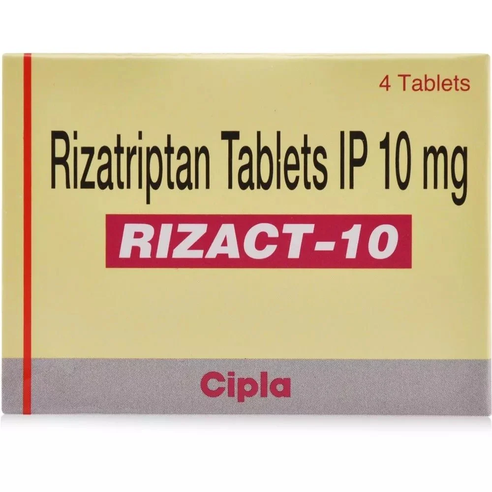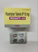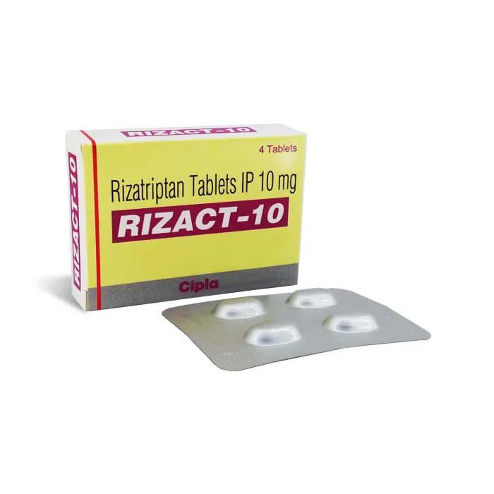 Rizact 10 mg tablet contains Rizatriptan and is used to treat acute migraine attacks (with or without aura) in adults. It works by constricting dilated blood vessels in the brain and blocking pain signals, providing relief from severe throbbing head pain, nausea, vomiting, and sensitivity to light/sound.